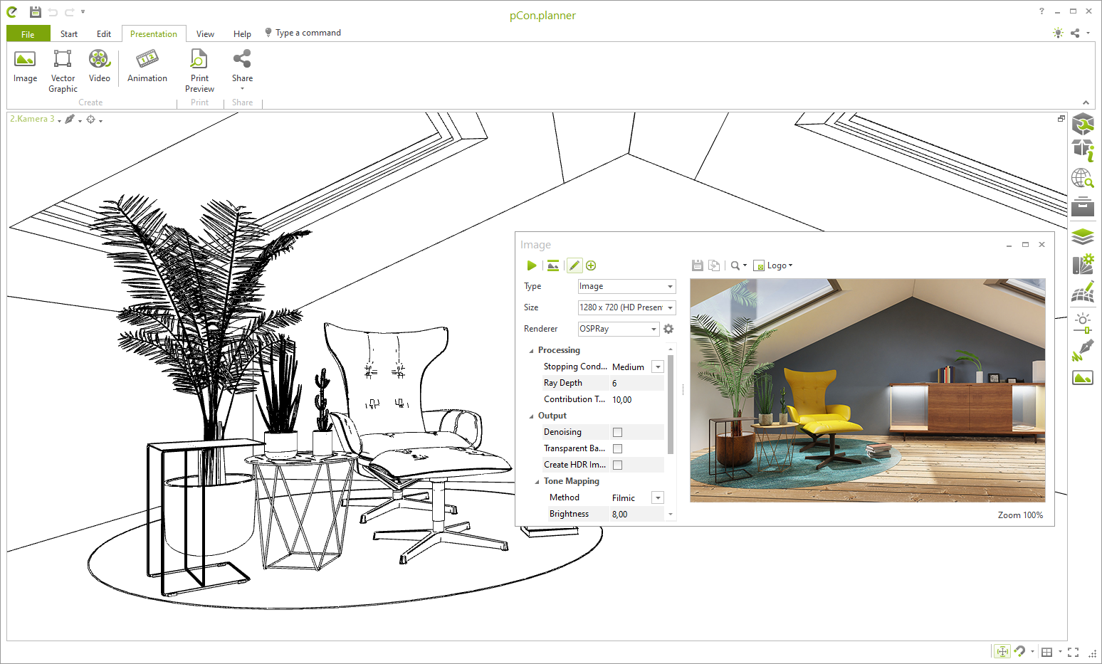 Opret gengivelser i høj kvalitet. Du behøver ingen ekspertviden til dette – pCon.planner gør det nemt for begyndere at skabe imponerende billeder. Billederne var i går. I dag er det gengivelse.